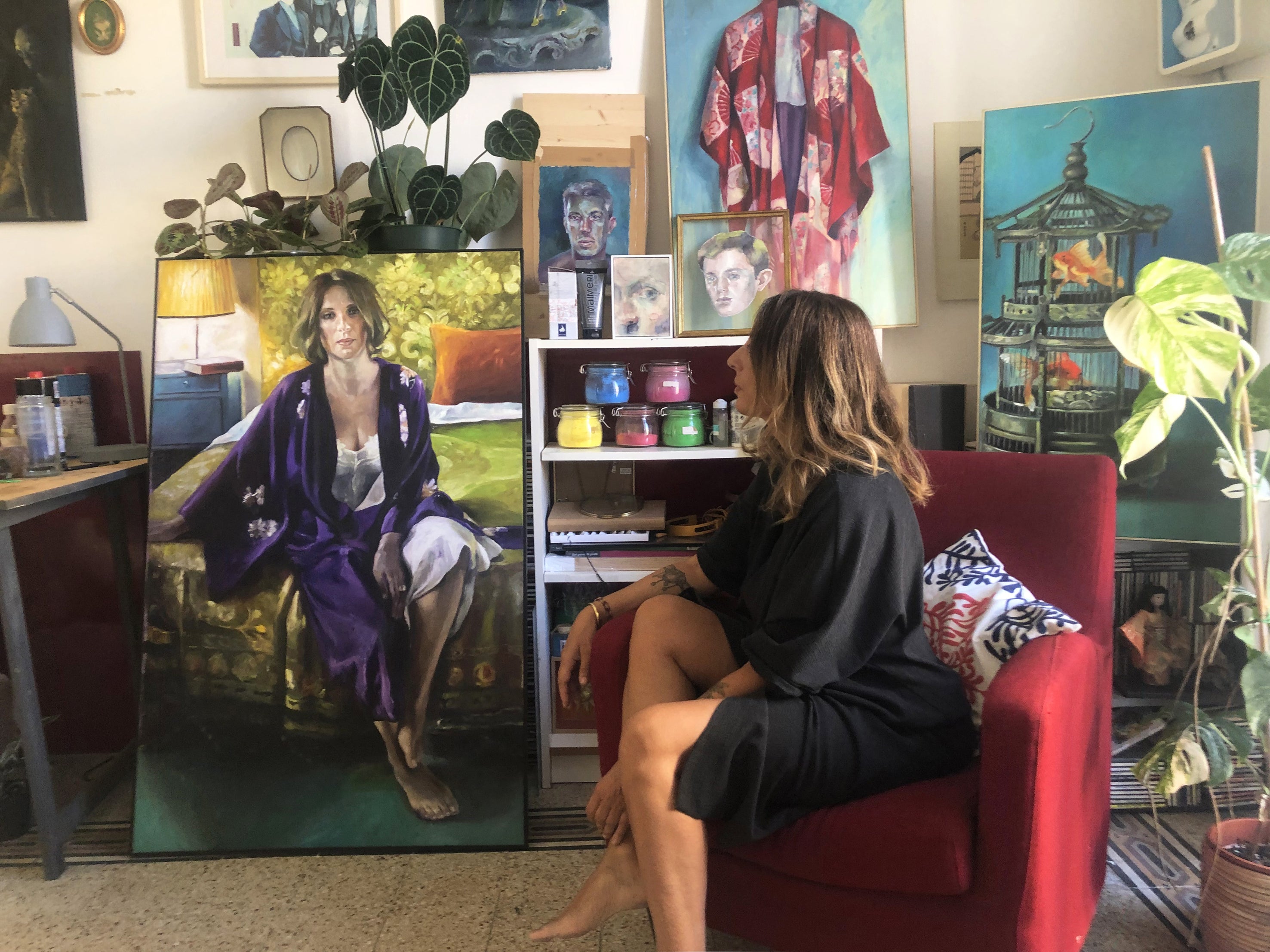 Her experience in fashion and theater profoundly influences her artistic research. After an initial phase of experimentation with collage on predominantly portrait subjects, she dedicated herself to oil painting, progressively defining her color palette and the choice of elements that inhabit her paintings, as if within a scenography. Her new production depicts interior views, intimate and domestic scenes, still lifes, old objects, and scenic compositions. Her works consistently reflect an implicit passion for alchemy, myth, and metamorphosis. Daniela Balsamo uses a European symbolism derived from Jungian influences, filled with objectified references that inhabit our subconscious; objects containing forgotten or repressed experiences, complexes, and memories. Dreams and nightmares, as well as premonitions, take the form of stage accessories, real or fantasy animals, creating surreal domestic situations like "The Man Who Mistook His Wife for a Hat." Free and refined sequences are staged in environments where the dimension of the subconscious is made manifest through details, like in a sophisticated Maugham text, living rooms waiting to be inhabited by conversations that are only seemingly superficial but can be perceived in their complex emotionality by a keen listener.